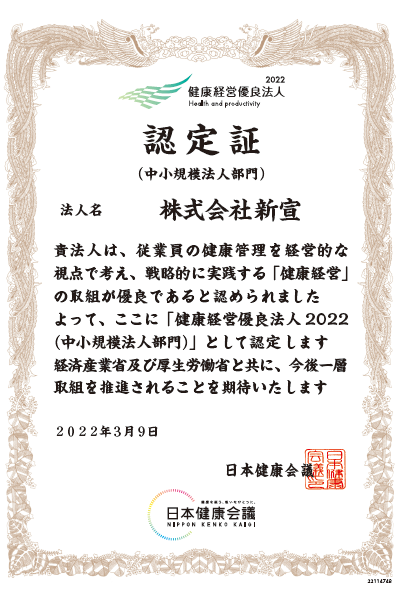 当社はこのたび、経済産業省と日本健康会議が進める、健康経営優良法人認定制度において、「健康経営優良法人 2022(中小規模法人部門)」の認定を受けました。