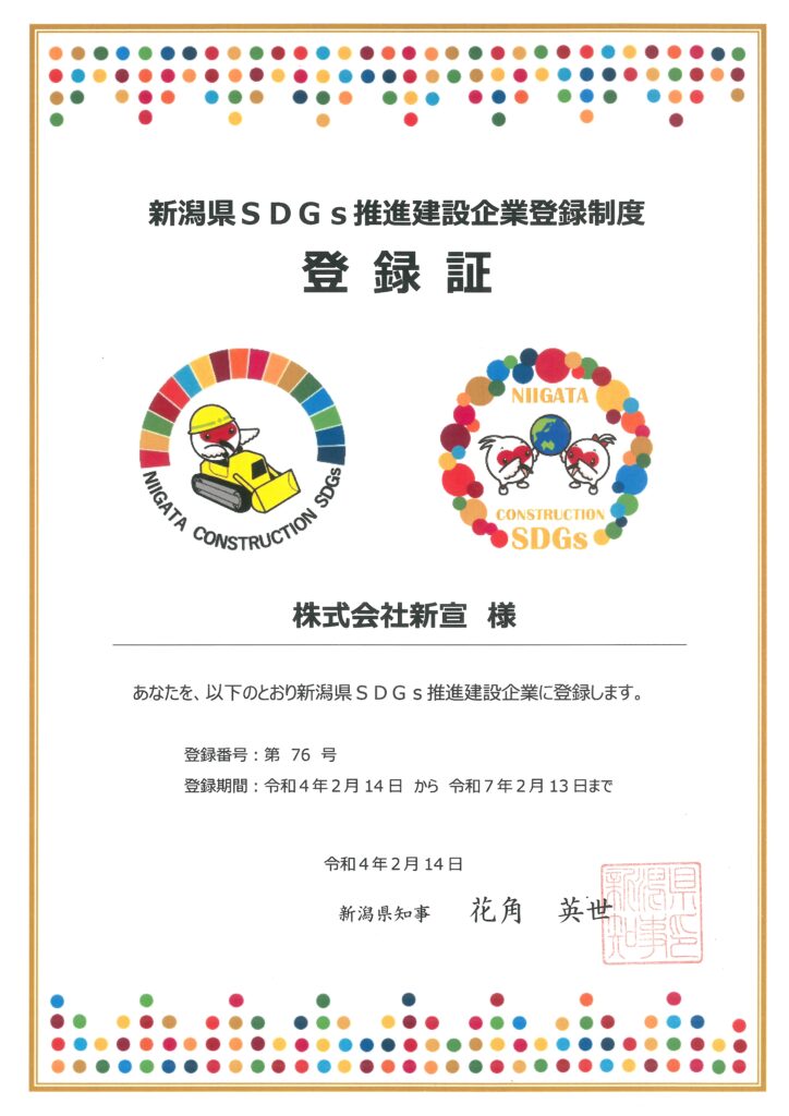 「新潟県SDGs推進建設企業登録制度」とは、県内建設企業の人材確保やイメージ向上、新たな事業機会の創出などを後押しするため、SDGsの推進に取り組む建設企業を登録し、その取組をPRする事を目的に創設された制度です。
